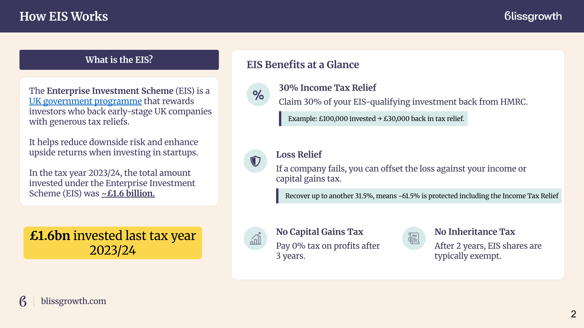No Inheritance Tax After 2 years, your EIS shares are usually free from inheritance tax.